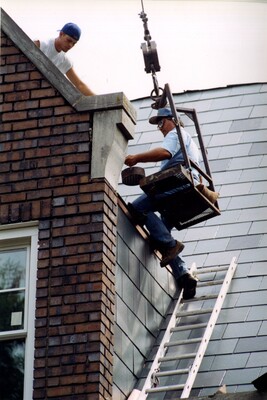 Color photo of two workers repairing the blue slate roof of Willard Hall. One stands on the peaked section, observing as the second, sitting in a seat suspended by a crane, working on the roof.