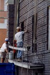 Color photo of two workers repairing one of the brick exterior sides of Willard Hall. They stand on a suspended walkway filling the spaces between the bricks with grout.