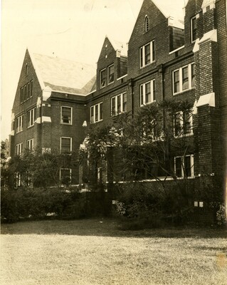 Black and white photo of the entrance to Frances E. Willard Hall for Girls used in the 1929 edition of the Kanza, taken from the west-northwest.