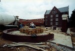 Color photo of the construction of Willard Plaza to the east of Willard Hall. The brick posts are up as is the brick semicircle to encompass a future fountain. Workers are filling the base for the fountain with cement
