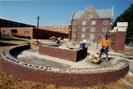 Color photo of construction workers filling the laid brick of the plaza with sand and flattening them.