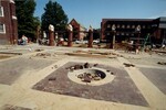 Color photo of Willard Plaza during its construction, the square pattern of bricks for the floor is almost finished being laid.