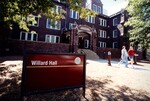 Color photo of the front of Willard Hall, the sign for the building is in the foreground. Two people are walking along the sidewalk away from the building. Straw, presumably to stop new growth during the construction of Willard Plaza, is spread out on the ground.