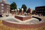 Color photo of the construction of Willard Hall Plaza. The cement for the fountain base is set and workers are finishing laying brick.