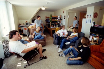 Color photo of a Willard dorm room, likely taken for promotional materials. 7 students sit in the communal space in the room and welcome another walking in with her laundry.