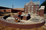 Color photo of a student walking out of Willard Hall. The ground is covered in straw, possibly to stop new growth before the desired plant life for the front of Willard was added.