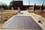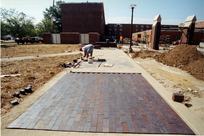 Color photo of workers laying bricks for the sidewalk and plaza at Willard Hall.