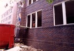 Color photo of two construction workers gutting the interior of Willard Hall. One uses a sledgehammer to off the plaster to expose the wood beams and walls while the other uses a scoop to discard the destroyed materials out the window.