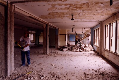 Color photo of two construction workers gutting the interior of Willard Hall. One uses a sledgehammer to off the plaster to expose the wood beams and walls while the other uses a scoop to discard the destroyed materials out the window.