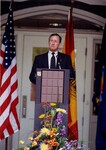 Color photo of a speaker at the Willard Hall Dedication ceremony. He is standing at a podium placed at the top of the steps to the front entrance of the dorm. Flowers have been placed at the base of the podium.