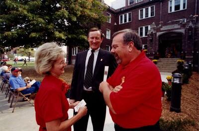 Color photo of PSU faculty talking at the Willard Hall Dedication, the left two of which were speakers for the event.