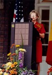 Color photo of a speaker at the Willard Hall Dedication ceremony. She is standing at a podium placed at the top of the steps to the front entrance of the dorm. Flowers have been placed at the base of the podium.