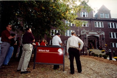 Color photo of attendees standing next to the sign for Willard Hall, listening to one of the speakers at the dorm's dedication ceremony.