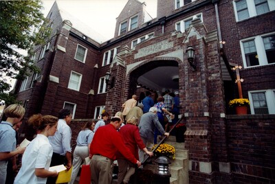 Color photo of Willard Hall Dedication attendees entering the newly renovated dorm.