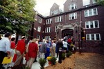 Color photo of Willard Hall Dedication attendees entering the newly renovated dorm.