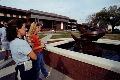Color photo of Willard Hall Dedication attendees checking out the new fountain in Lindsburg Plaza