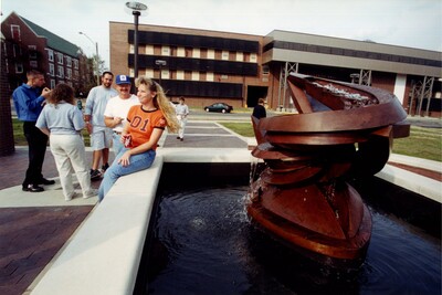 Color photo of Willard Hall Dedication attendees hanging out at the new fountain in Lindsburg Plaza as they enjoy refreshments.