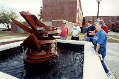 Color photo of Willard Hall Dedication attendees checking out the new fountain in Lindsburg Plaza