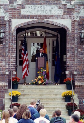 Color photo of Randy Roberts, then Archivist of Pittsburg State Special Collections and University Archives, speaking at the Willard Hall Dedication. He is standing at a podium placed at the top of the steps leading to the dorm building.