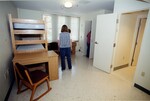 Color photo of Pittsburg State employees, including President Bryant, attending an open house tour of Willard Hall. They are checking out a dorm room with a set of bunk beds, currently vacant.