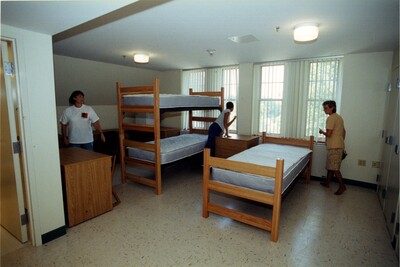 Color photo of Pittsburg State employees, including President Bryant, attending an open house tour of Willard Hall. They are checking out a dorm room with three beds, currently vacant.