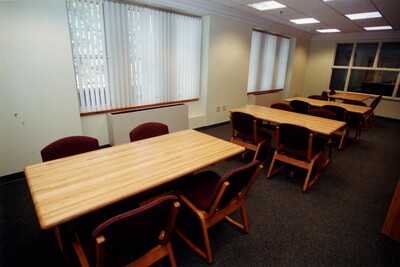Color photo of a communal study space with desks in Willard Hall, taken during an open house tour while President Bryant and other employees were visiting.