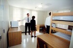 Color photo of Pittsburg State employees, including President Bryant, attending an open house tour of Willard Hall. They are checking out a dorm room with a set of bunk beds, currently vacant.