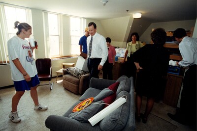 Color photo of President Bryant and other employees visiting student in their newly furnished dorm room in Willard Hall during an open house tour. The students living in the room have added some arm chairs and a couch to their space.