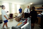 Color photo of President Bryant and other employees visiting student in their newly furnished dorm room in Willard Hall during an open house tour. The students living in the room have added some arm chairs and a couch to their space.