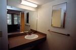 Color photo of the restroom inside a dorm in Willard Hall, taken during an open house tour given to Pitt State employees and President Bryant.